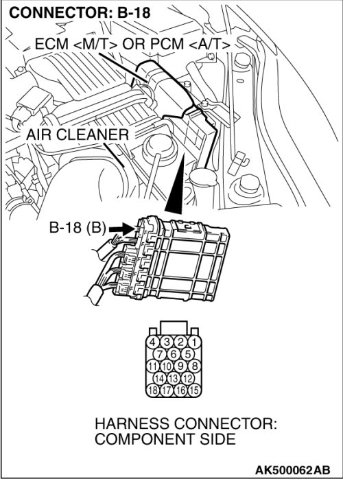 STEP 13. Check connector B-18 at ECM [M/T] or PCM [A/T] for damage.