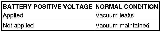 4. As described in the chart below, check airtightness by applying a vacuum with voltage applied directly from the battery to the EVAP purge solenoid valve and without applying voltage.