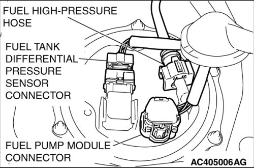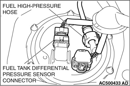 Disconnect the fuel tank differential pressure sensor connector and fuel high-pressure hose.