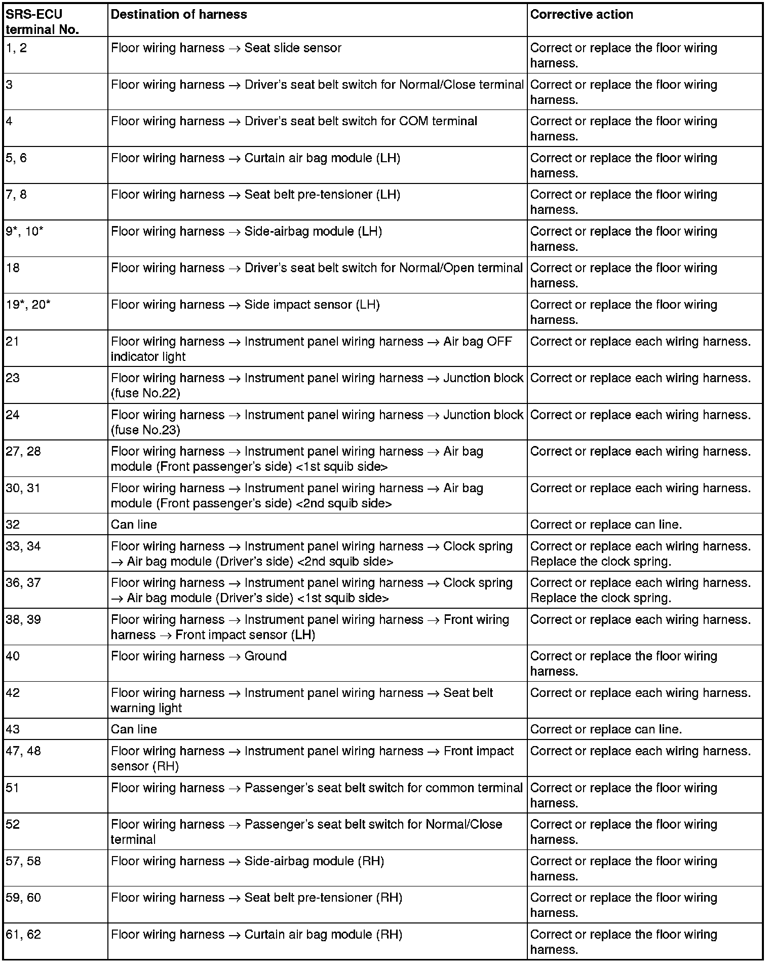 - Do not attempt to repair the wiring harness connectors of the SRS. If any of the connectors are diagnosed as faulty, replace the wiring harness. If the wires are diagnosed as faulty, replace or repair the wiring harness according to the following table.