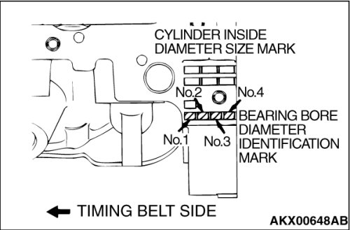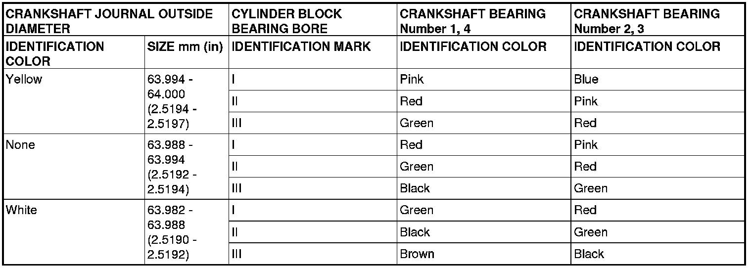 From the above table, select a bearing whose size is appropriate for the crankshaft journal outside diameter. If the crankshaft journal outside diameter ID color is "yellow" and the cylinder block bearing bore ID mark is "III," for example, select a bearing whose ID color is "green" [Number 1, 4]