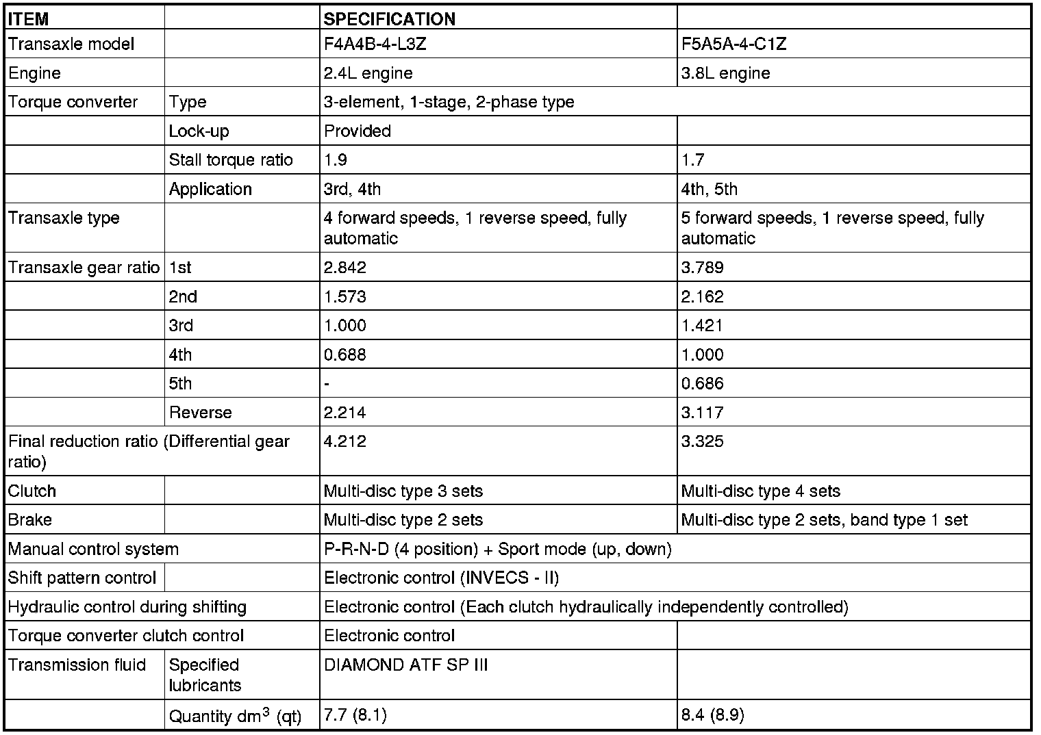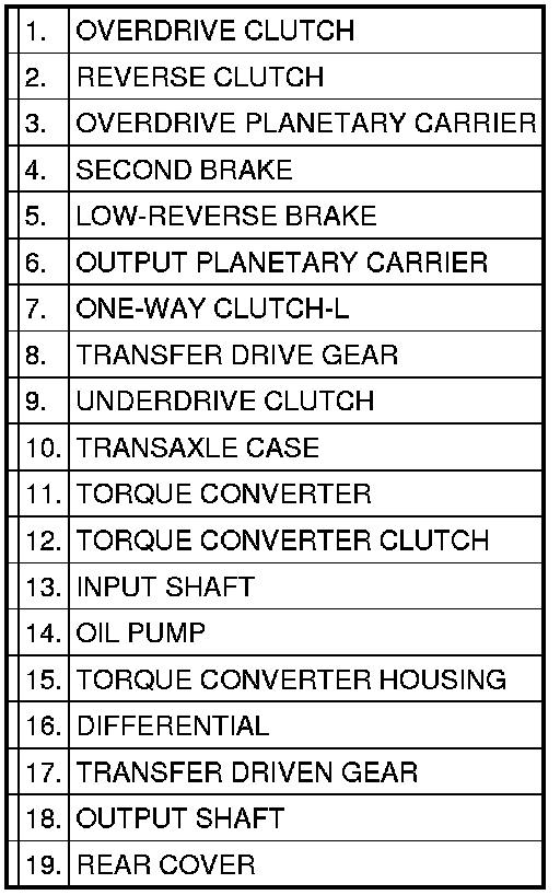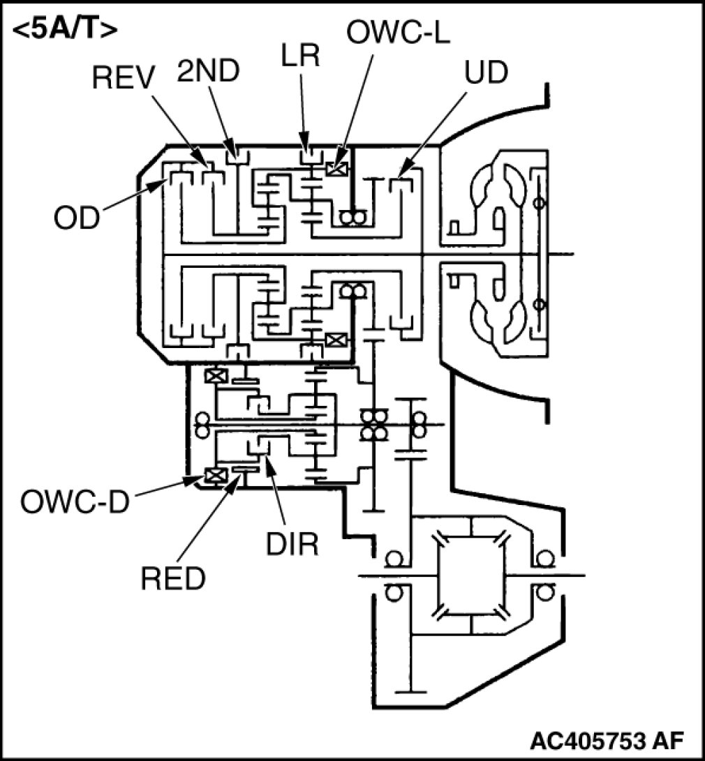 The transaxle is made up of the torque converter and gear train. A 3-element, 1-stage, 2-phase torque converter with built-in torque converter clutch is used. The gear train of F4A4B transaxle consists of 3 sets of multi-disc type clutches, 2 sets of multi-disc type brakes, and 2 sets of planetary gears which are composed of a sun gear, carrier, annulus gear, and pinion gear. Also, the gear train of F5A5A transaxle consists of 4 sets of multi-disc type clutches, 2 sets of multi-disc type brakes, 1 set of band type brake, 1 set of one-way clutch, and 3 sets of planetary gears which consists of a sun gear, carrier, annulus gear, and pinion.