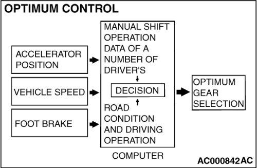 1. The shift patterns found satisfying by the typical driver for all ranges of driving are stored in the computer's memory. The computer uses this data to analyze road conditions and the driver's style of operation, and then sends the optimal shift patterns stored in its memory to best match the conditions.
