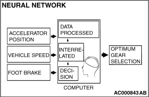 "neural network" that works to imitate the decision-making processes of the human brain. The neural network links a wide variety of input data regarding road and operating conditions, and instantly makes accurate shift control decisions.