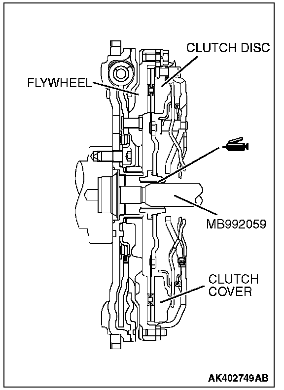 2. Using special tool MB992059 to position the clutch disc on the flywheel.