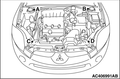 (1) Set special tool MB991895 to the front fender mounting bolts (A and B) and the radiator support upper insulator mounting bolts (C and D), which are located in the engine compartment, as shown.