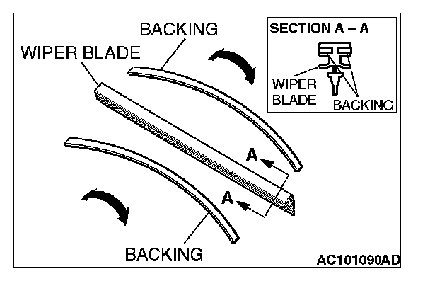 CAUTION: Ensure that the backings are bent in the direction indicated, and then install the backings to the wiper blade rubber.