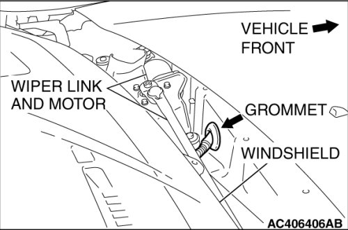 Disengage the harness grommet as shown in the illustration before removing the wiper link and motor.