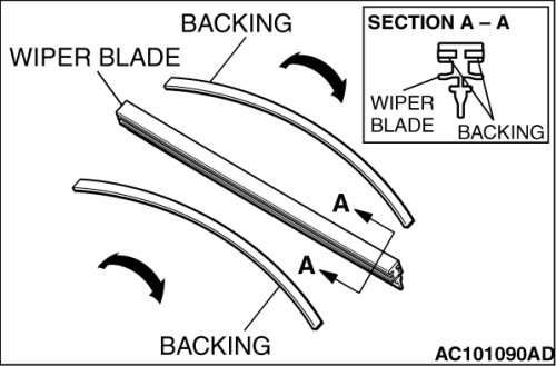 Ensure that the backings are bent in the direction indicated, and then install the backings to the wiper blade rubber.