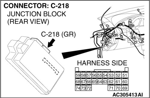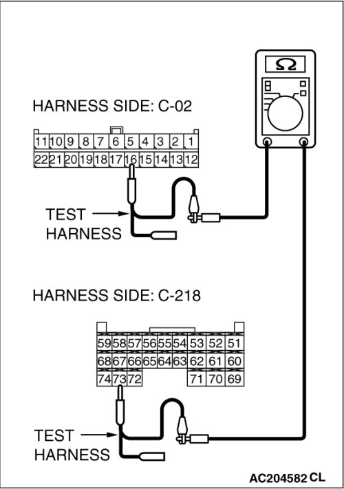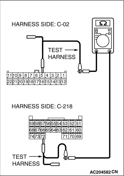 (1)Disconnect joint connector (3) C-02 and ETACS-ECU connector C-218, and measure the resistances at the wiring harness sides of joint connector (3) C-02 and ETACS-ECU connector C-218.