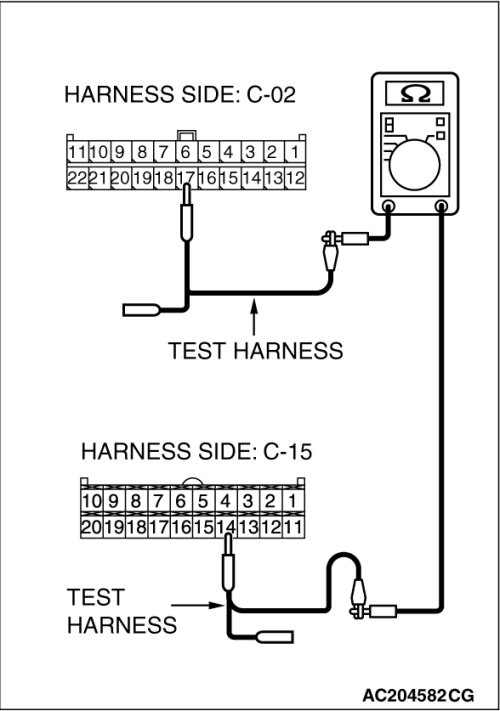 STEP 13. Check the CAN bus lines between joint connector (3) and the A/C-ECU. Measure the resistance between joint connector (3) C-02 and A/C-ECU connector C-15.