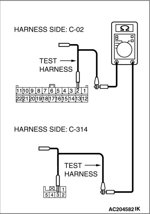 (1)Disconnect joint connector (3) C-02 and steering wheel sensor connector C-314, and measure the resistances at the wiring harness sides of joint connector (3) C-02 and steering wheel sensor connector C-314.