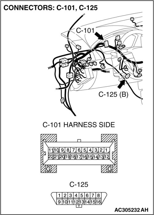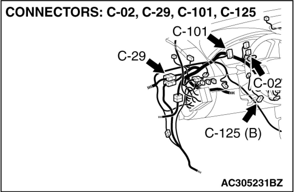 STEP 1. Check powertrain control module connector B-19, combination meter connector C-101 and data link connector C-125 for loose, corroded or damaged terminals, or terminals pushed back in the connector.