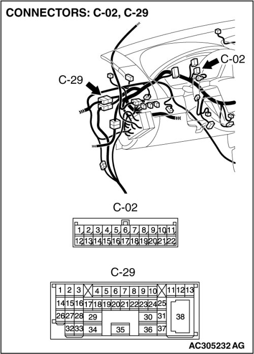 (1)Disconnect intermediate connector C-29 and joint connector (3) C-02, and measure the voltage at the wiring harness side of joint connector (3) C-02.