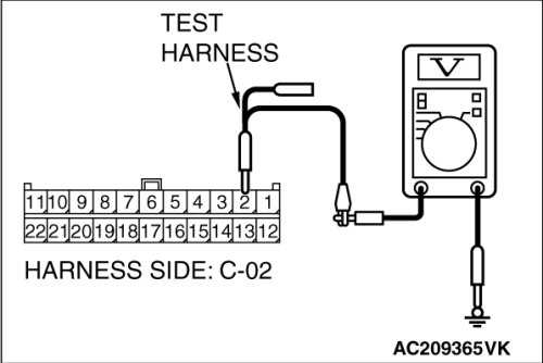 (1)Disconnect joint connector (3) C-02 and multi-center display unit connector C-31 [Mitsubishi Multi Communication System], and measure the voltage at the wiring harness side of joint connector (3) C-02.
