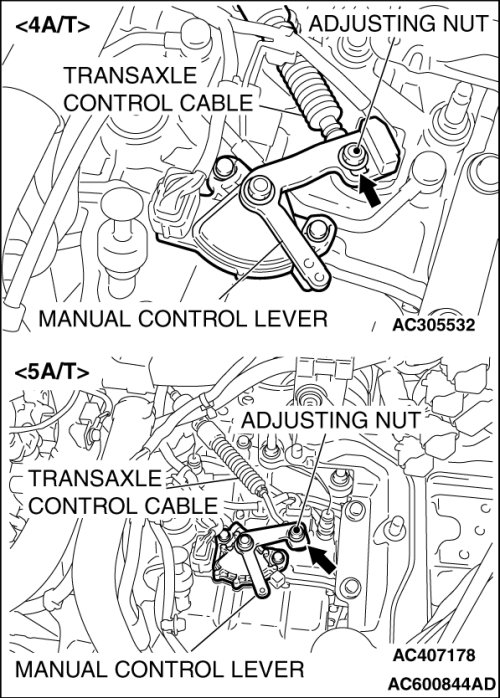 6. Gently push the transaxle control cable in the direction of the arrow, until the cable is taut. Tighten the adjusting nut.
