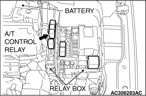 2. Use jumper wires to connect A/T control relay terminal 3 to the negative battery terminal and terminal 2 to the positive battery terminal.