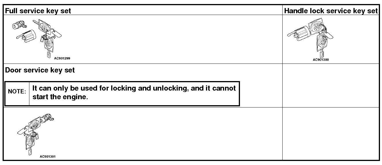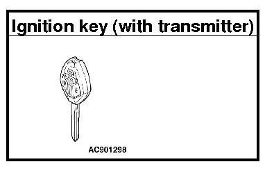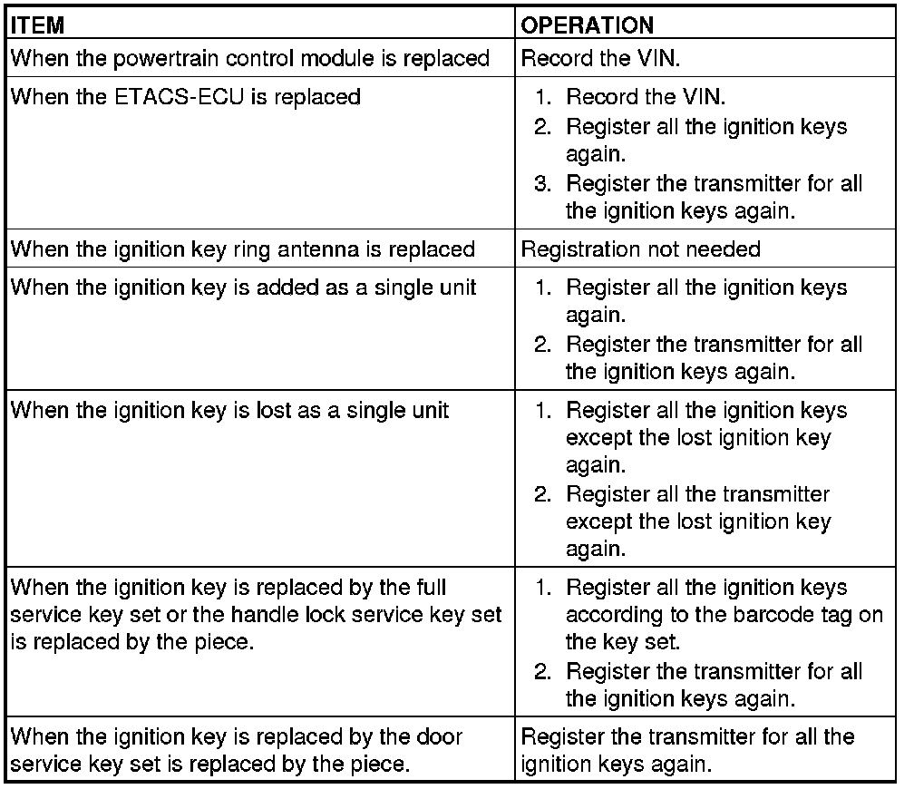The ignition key contains a transponder (small transmitter), which retains an unique encrypted code. When replacing the parts of the immobilizer system, always register the encrypted code or VIN, or both of them according to the list below. The ETACS-ECU can retain a maximum of eight different encrypted codes. This means that a maximum of eight ignition keys can be registered.