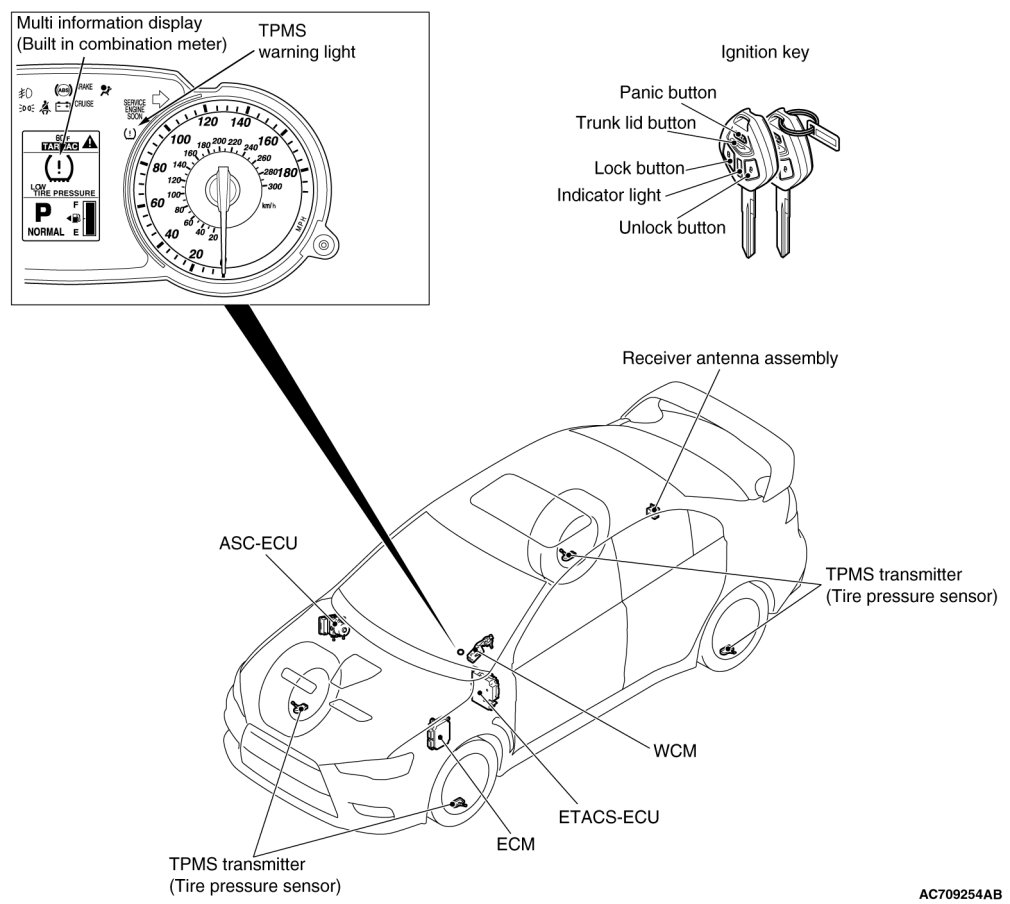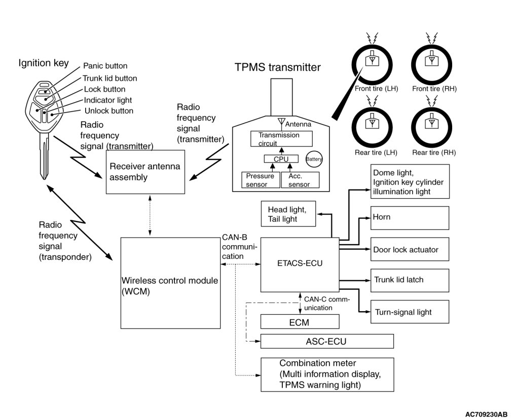 In case of replacement of WCM, all keyless ID, key ID and tire pressure sensor ID should be re-registered using scan tool MB991958 (M.U.T.-III sub-assembly).