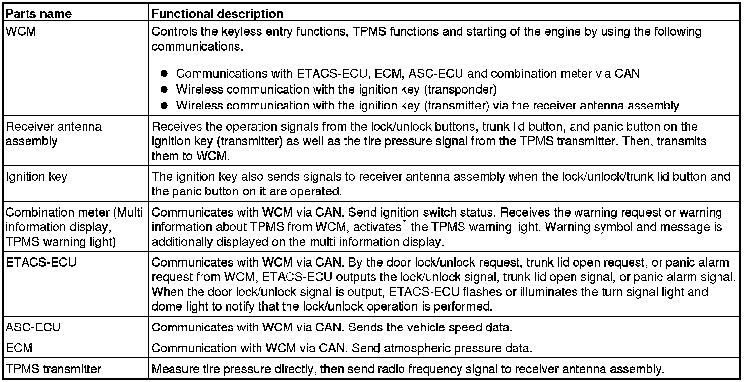 The wireless control module (WCM) is a system that integrates the keyless entry function, with which remote operation (opening/closing of all doors, opening of trunk lid, and operation of warning function that warns a person who intends to damage the vehicle *), can be performed by operating the lock/unlock button, trunk lid button or panic button on the ignition key (transmitter). Also, WCM incorporates the immobilizer function, which prohibits the starting of engine using an unauthorized key, and the tire pressure monitoring system (TPMS), which issues a warning to a driver by illuminating or flashing the warning light if an abnormality to the tire pressure or the system error is detected. WCM has the following features: