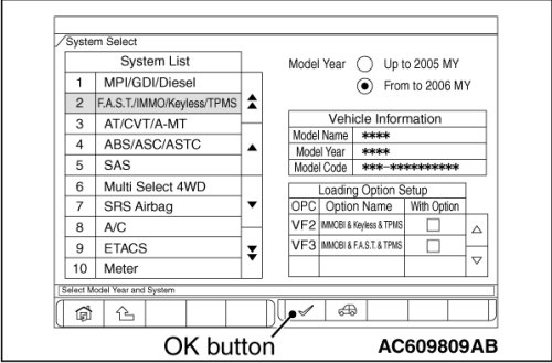 2. Select "F.A.S.T./IMMO/Keyless/TPMS" button from the "System Select" screen. Then, select the applicable option code item and push the OK button.