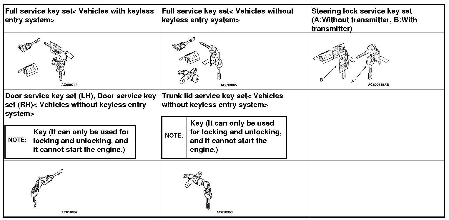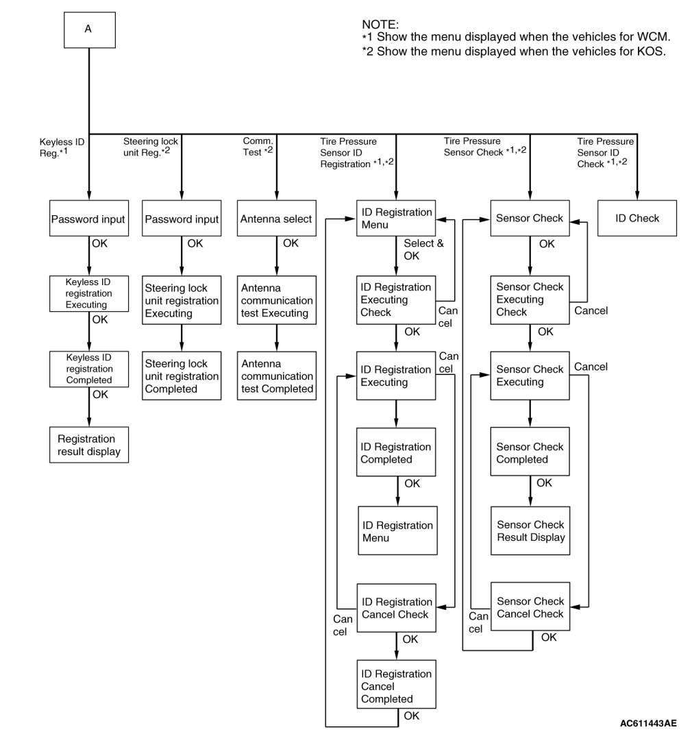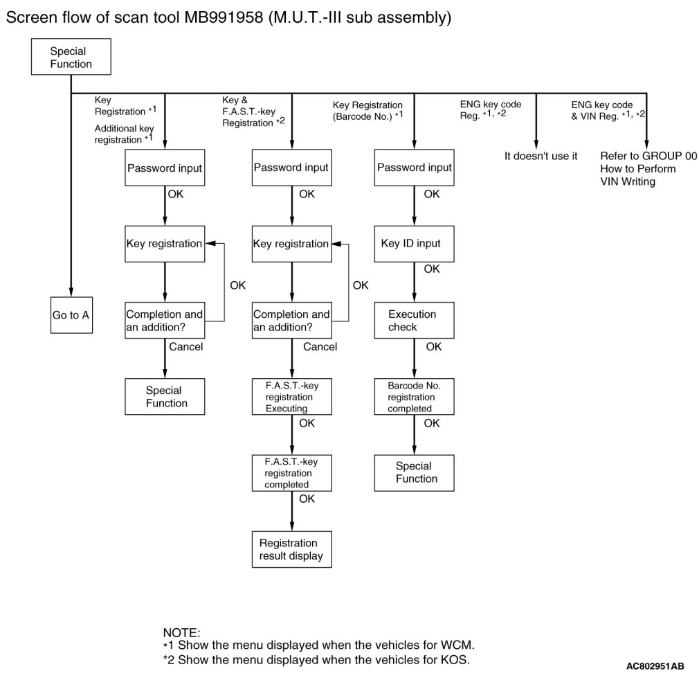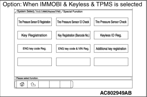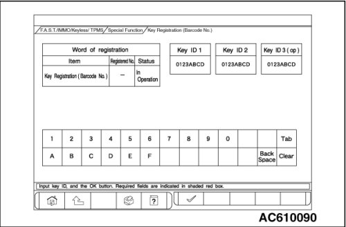 The ID codes necessary for the engine immobilizer system, the keyless entry system and the TPMS can be registered using the scan tool MB991958 (M.U.T.-III sub assembly). KOS and keyless operation key are indicated as F.A.S.T and F.A.S.T.-key respectively in the scan tool MB991958