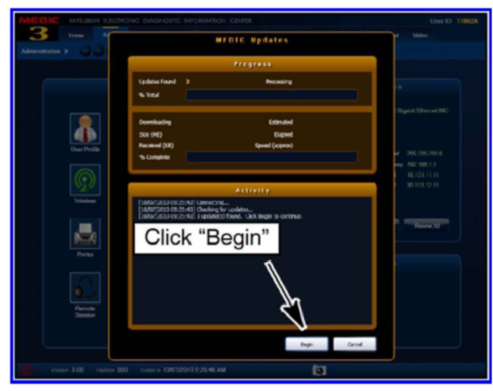 4. The MEDIC Updates screen appears. If you see "Updates Available" in the "Activity" panel, click the "Begin" button.