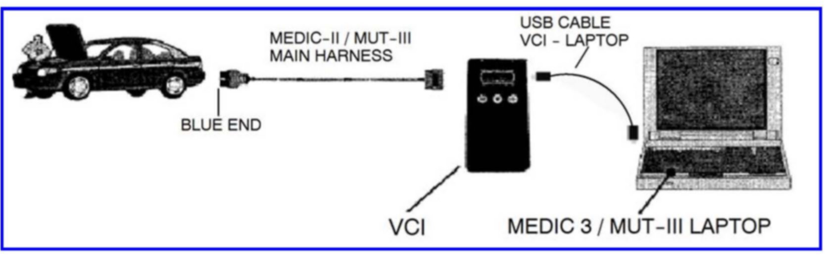 ^ Connect the MUT-III main harness with the blue DLC connection to the VCI.