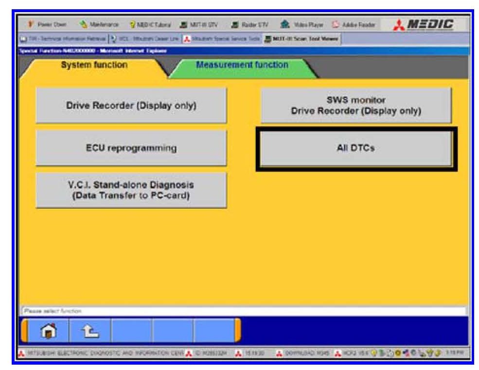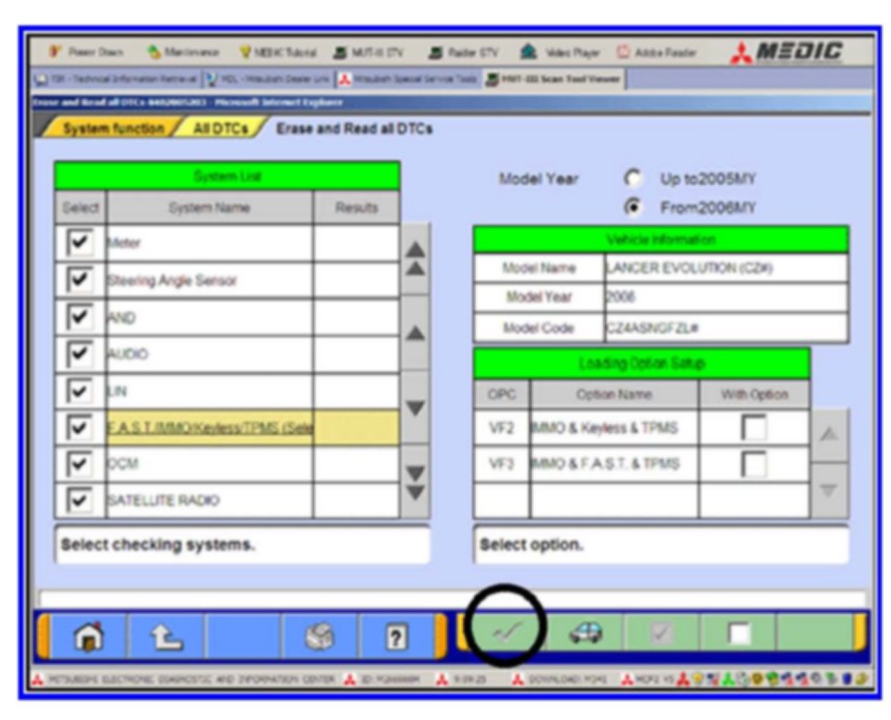 3. Using the MUT-III, check and erase ALL DTCs from all systems as follows.