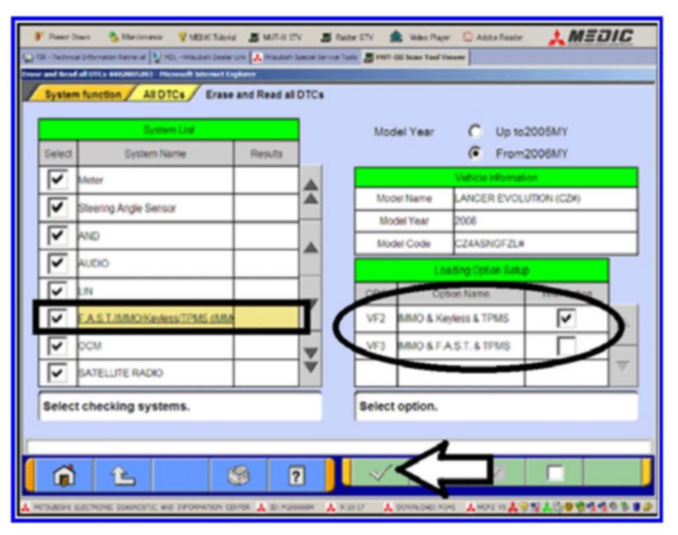 d. In the left column scroll to and click FAST/IMMOB/KEYLESS. In the right column check the correct option code (VF#) from the Loading Options Setup list. This will activate the check mark at the bottom of the page.
