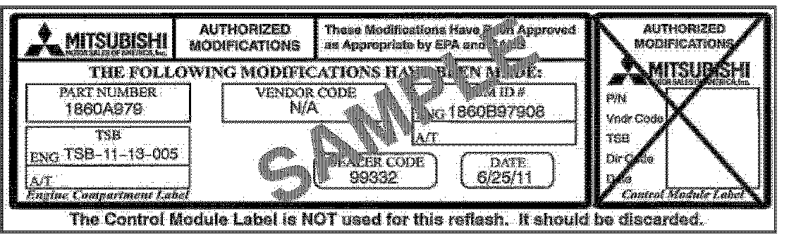 6. Using a ball-point pen enter the appropriate Engine Control Module (ECM) part number Software Part Number (ROM ID#) this Technical Service Bulletin number (TSB-11-13-005), your dealer code and the current date on the Engine Compartment / Control Module Label (p/n M55F024G00). The Vendor Code is not applicable. The label is available from your facing PDC.