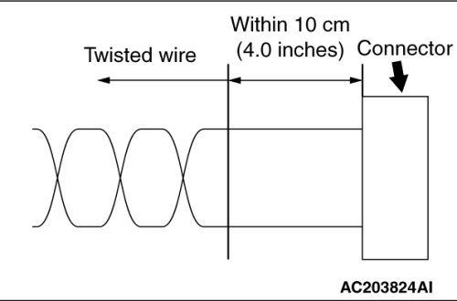 - If the connector or wire on the main bus line or the sub-bus wire is replaced, the frayed end of the twisted wire should be within 10 cm (4 inches) from the connector. If it exceeds 10 cm (4 inches), twist the wiring harness just like the original twisted wire. If the frayed end exceeds 10 cm (4 inches), noise suppression is deteriorated, causing a communication error.