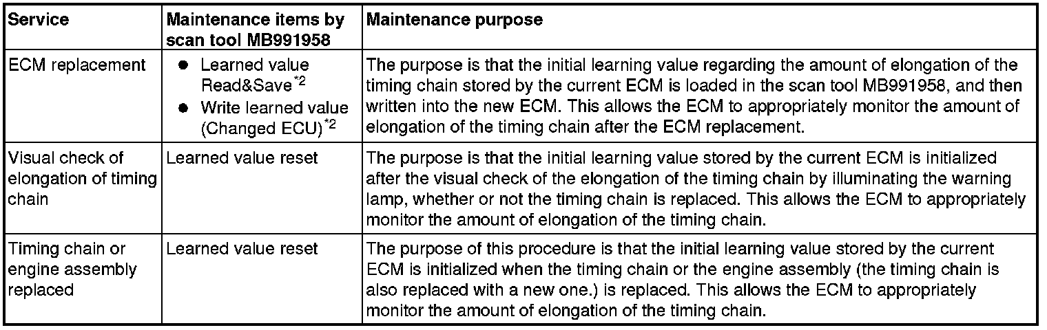 The ECM stores the timing chain conditions as the initial learning value when the timing chain is installed. The ECM stores the amount of elongation of the timing chain in the EEPROM as the current learning value, compared with the initial learning value. The ECM judges that the visual check of the elongation of the timing chain is necessary when the current learning value exceeds the specified value. Thus, use the scan tool MB991958 to always carry out the maintenance of the initial learning value related to the timing chain that is stored by the ECM after the following service.