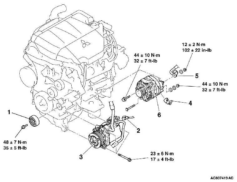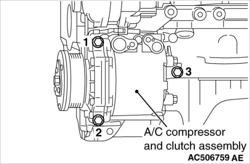 Tighten A/C compressor and clutch assembly mounting bolts to the specified torque in the order of number shown in the illustration.