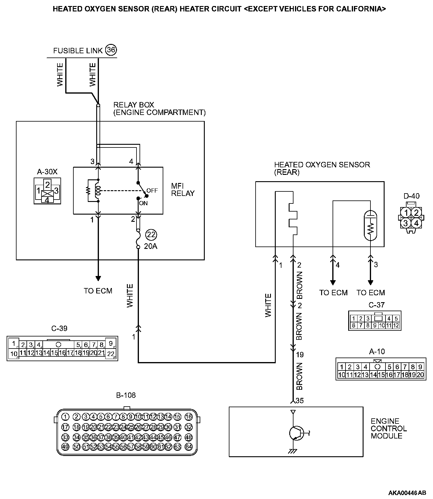 STEP 9. Check for harness damage between heated oxygen sensor (rear) connector D-40 (terminal No. 2) and ECM connector B-108 (terminal No. 35).