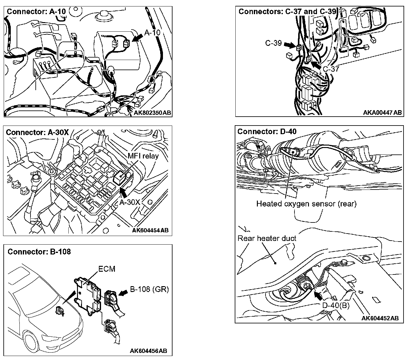 STEP 8. Check for harness damage between MFI relay connector A-30X (terminal No. 2) and heated oxygen sensor (rear) connector D-40 (terminal No. 1).