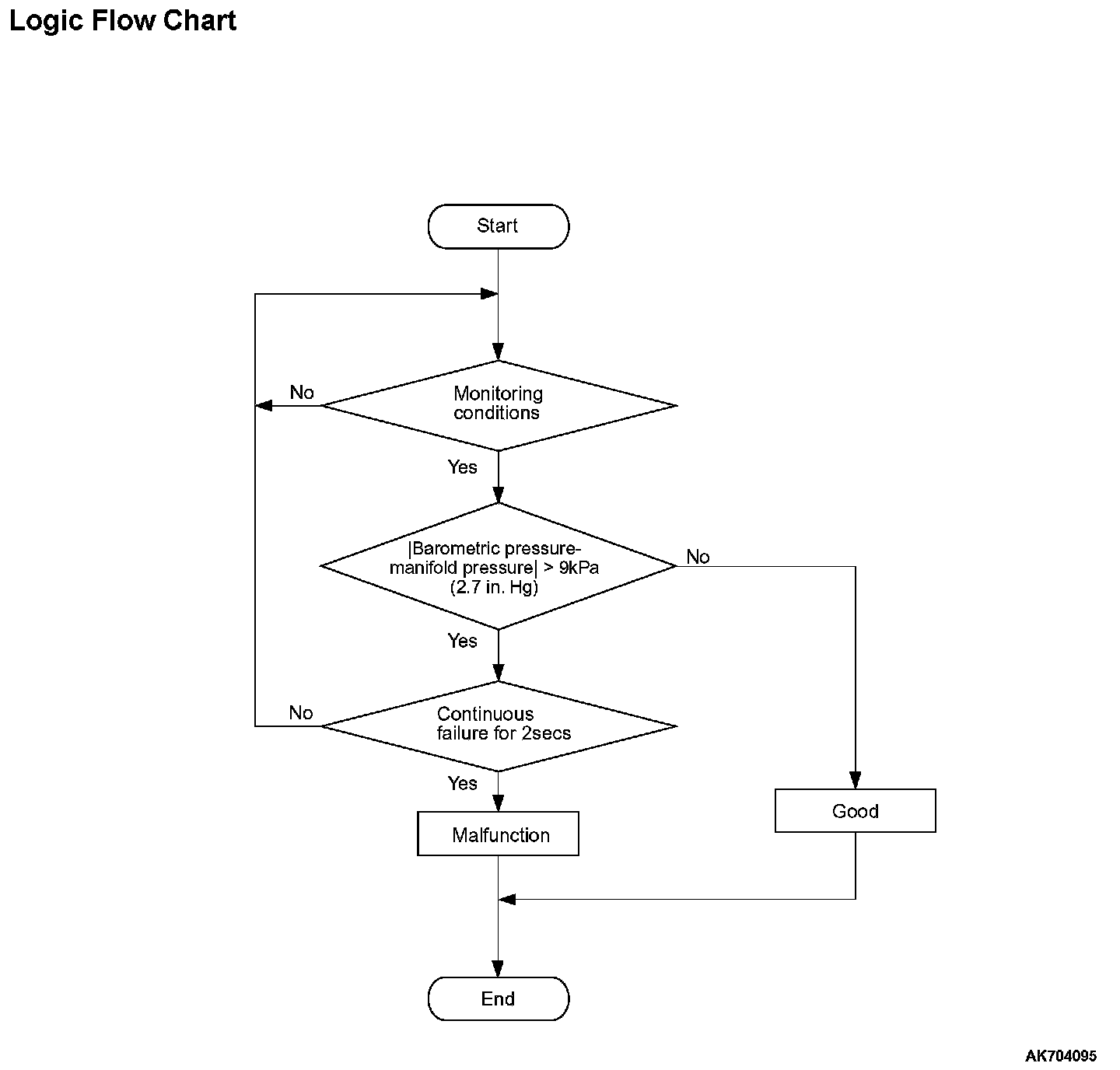- Difference between barometric pressure sensor output and manifold absolute pressure sensor output is more than 9 kPa (2.7 in.Hg) for 2 seconds.
