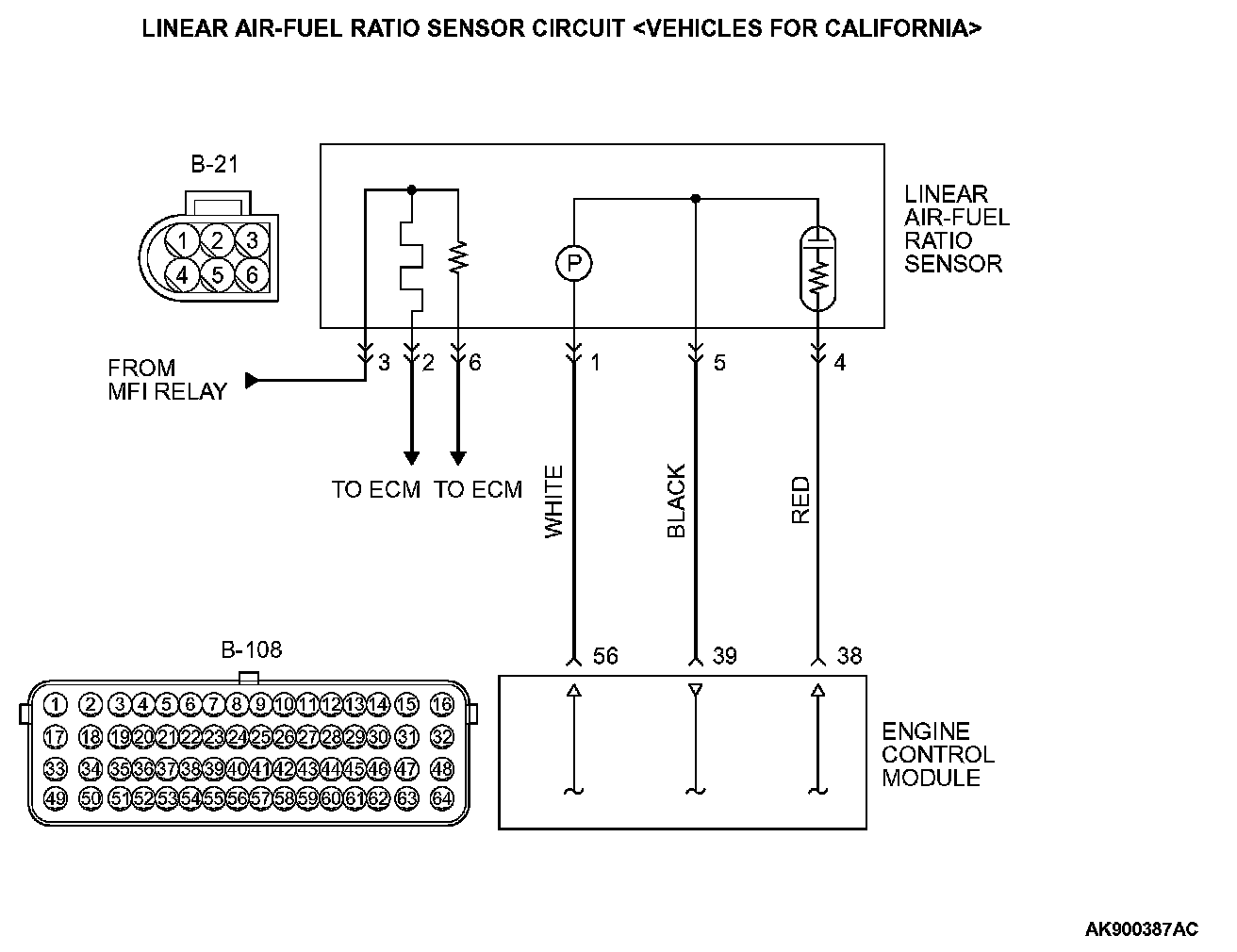 - The auxiliary line between the linear air-fuel ratio sensor (terminal No. 4) and the ECM (terminal No. 38) detects the air-fuel ratio.
