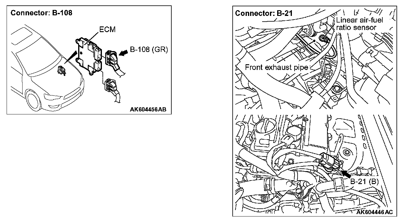 STEP 1. Check harness connector B-21 at linear air-fuel ratio sensor and harness connector B-108 at ECM for damage.