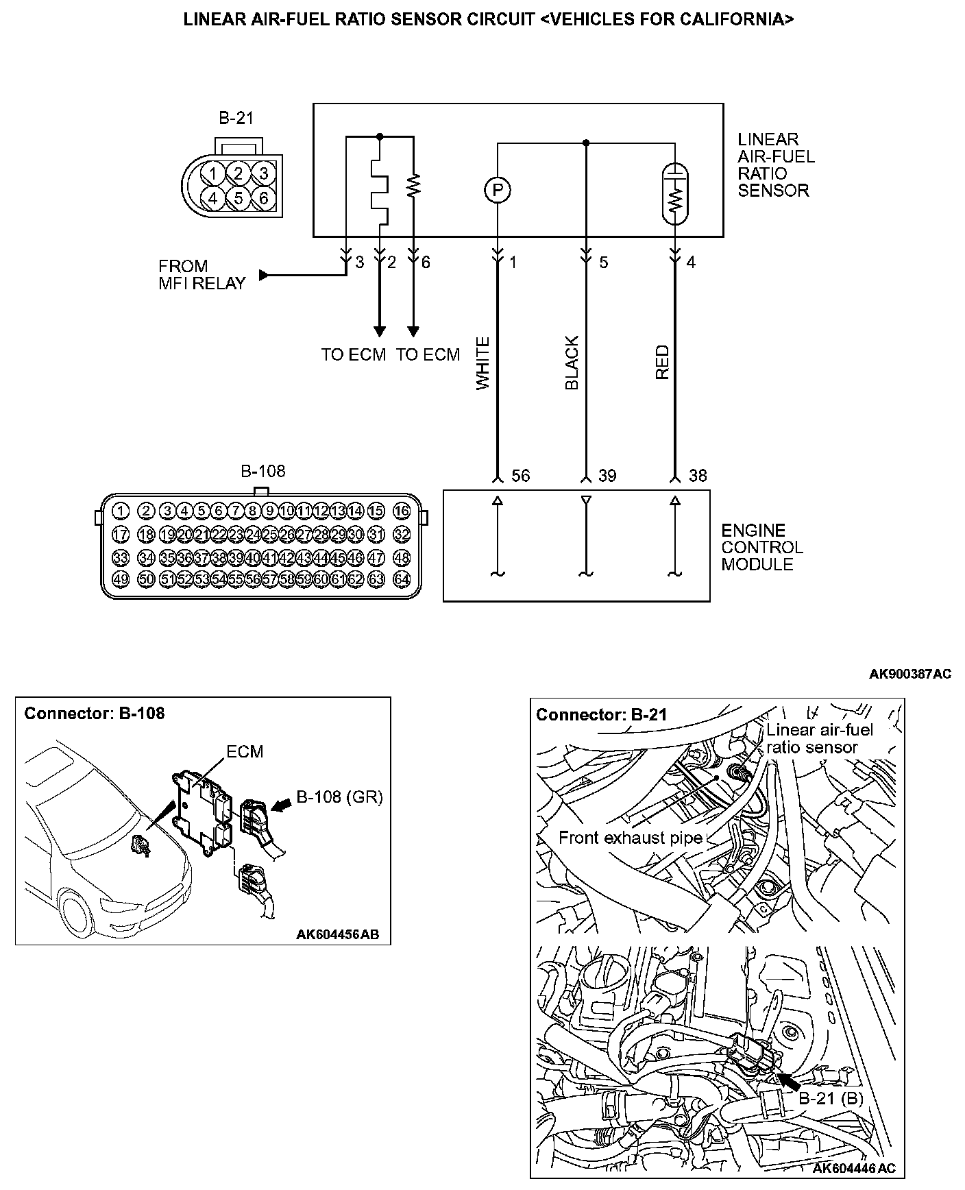 - The line between the linear air-fuel ratio sensor (terminal No. 1) and the ECM (terminal No. 56) detects the air-fuel ratio.