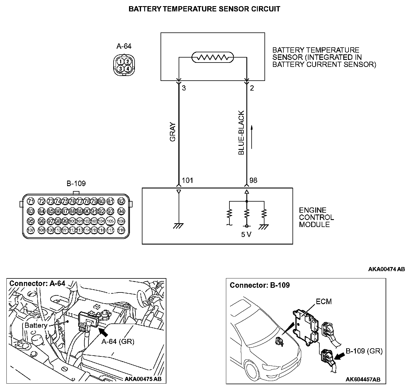 - Approximately 5 volts are applied to the battery temperature sensor output terminal (terminal No. 2) from the ECM (terminal No. 98) via the resistor in the ECM. The ground terminal (terminal No. 3) is grounded with ECM (terminal No. 101).