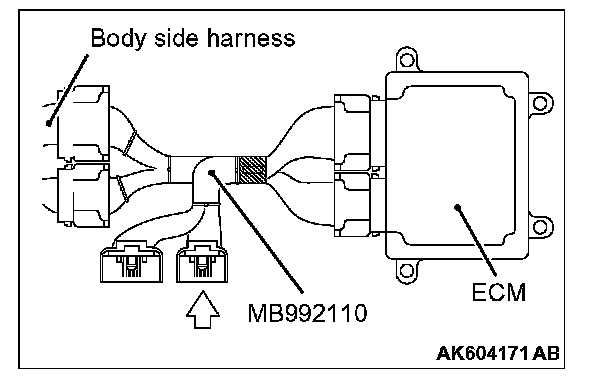 1. Disconnect all ECM connectors. Connect the power plant ECU check harness special tool MB992110 between the separated connectors.