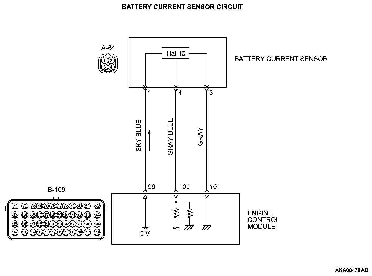 - A 5-volt voltage is supplied to the battery current sensor power terminal (terminal No. 1) from the ECM (terminal No. 99). The ground terminal (terminal No. 3) is grounded with ECM (terminal No. 101).