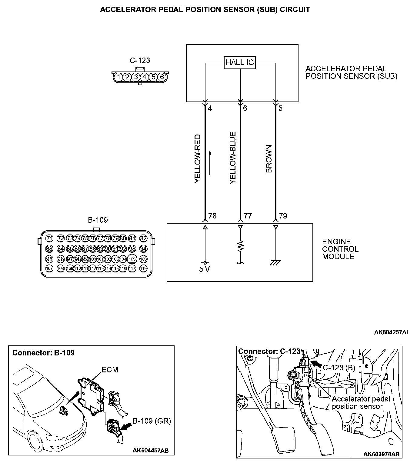 STEP 9. Check for open circuit, short circuit to ground and harness damage between accelerator pedal position sensor connector C-123 (terminal No. 6) and ECM connector B-109 (terminal No. 77)