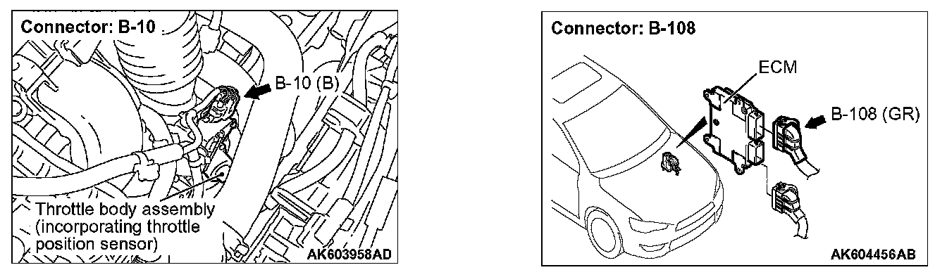 STEP 10. Check for harness damage between electronic-controlled throttle valve connector B-10 (terminal No. 4) and ECM connector B-108 (terminal No. 10).