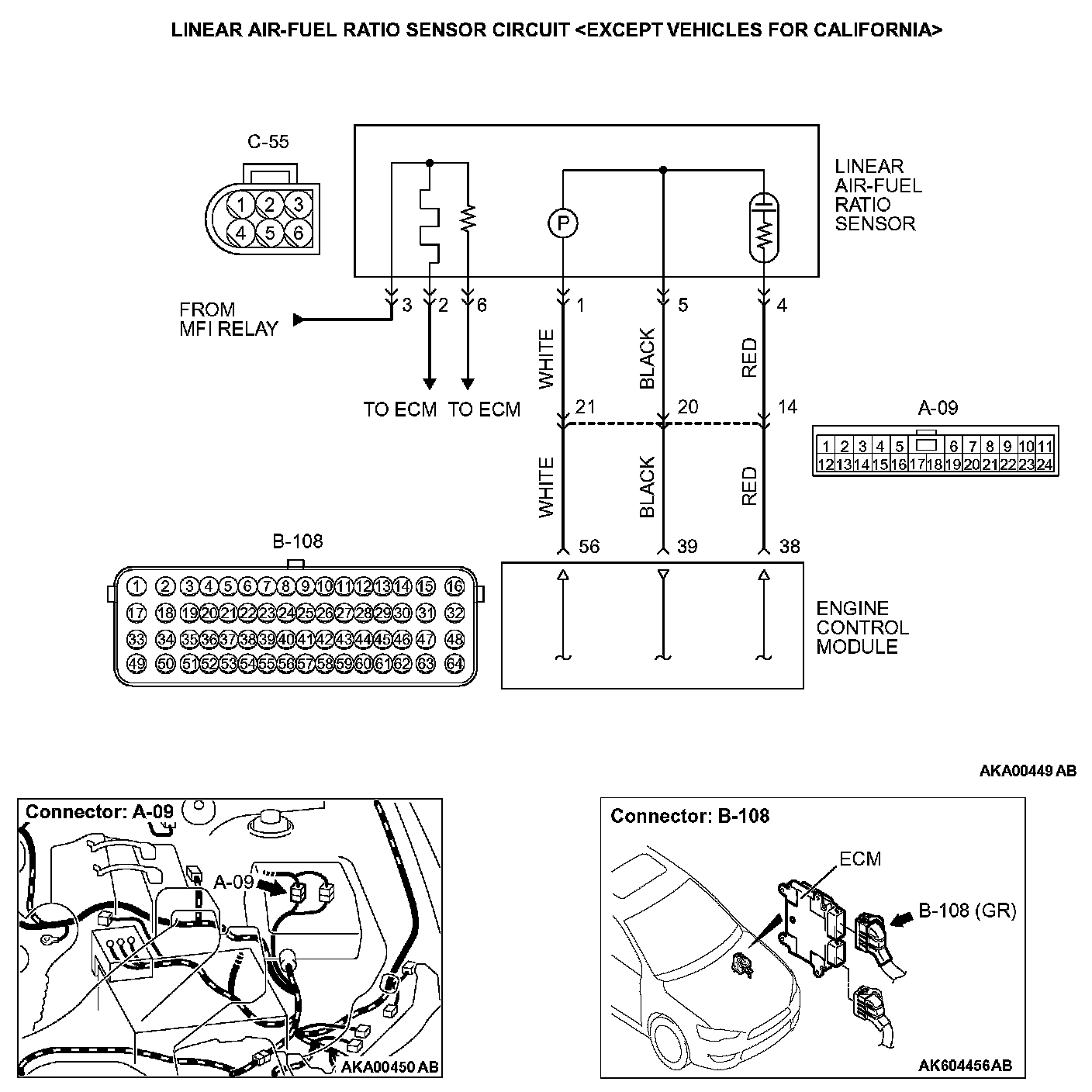 STEP 2. Check for open circuit between linear air-fuel ratio sensor connector C-55 (terminal No. 4) and ECM connector B-108 (terminal No. 38).