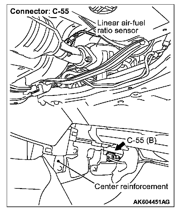 STEP 1. Check harness connector C-55 at linear air-fuel ratio sensor and harness connector B-108 at ECM for damage.
