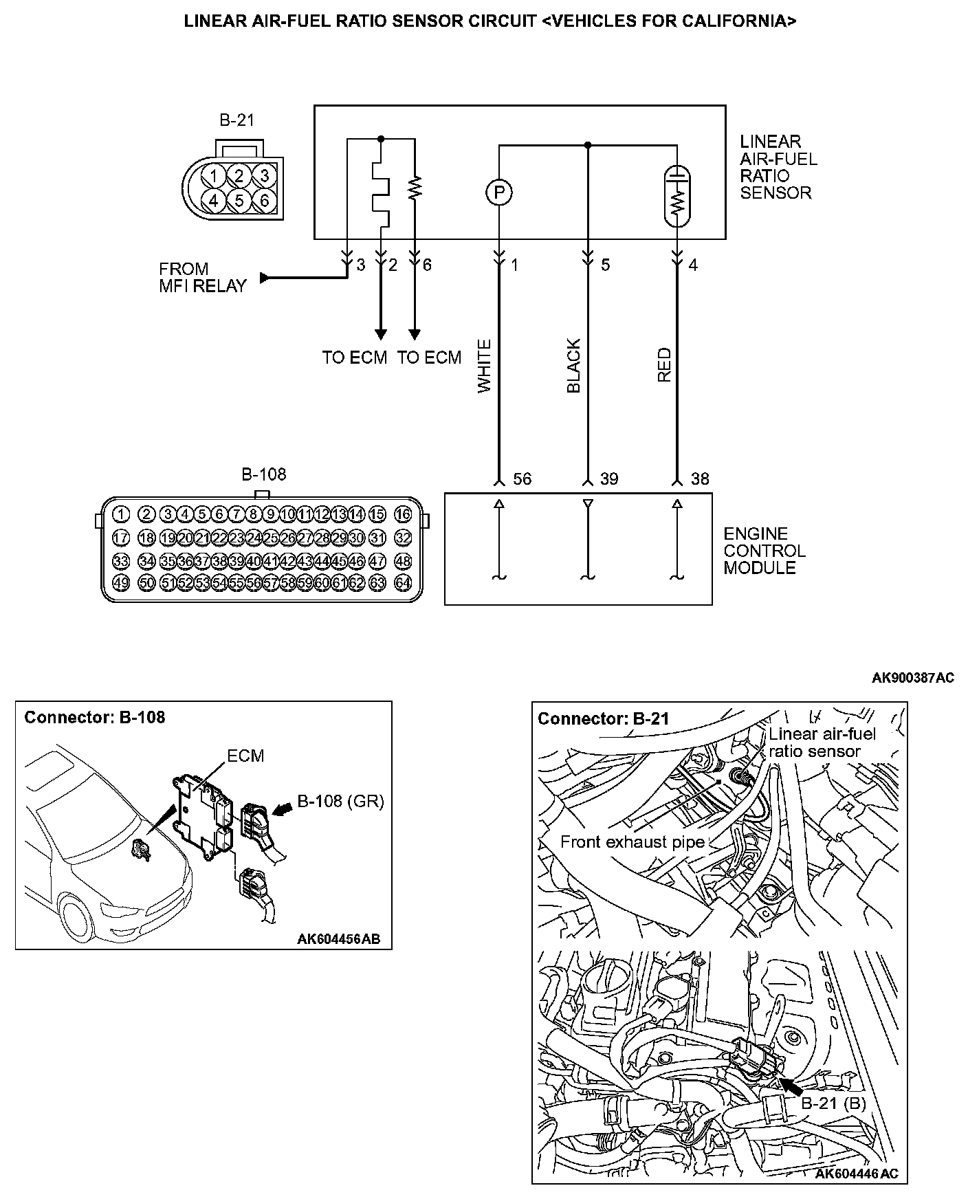 STEP 2. Check for open circuit between linear air-fuel ratio sensor connector B-21 (terminal No. 4) and ECM connector B-108 (terminal No. 38).