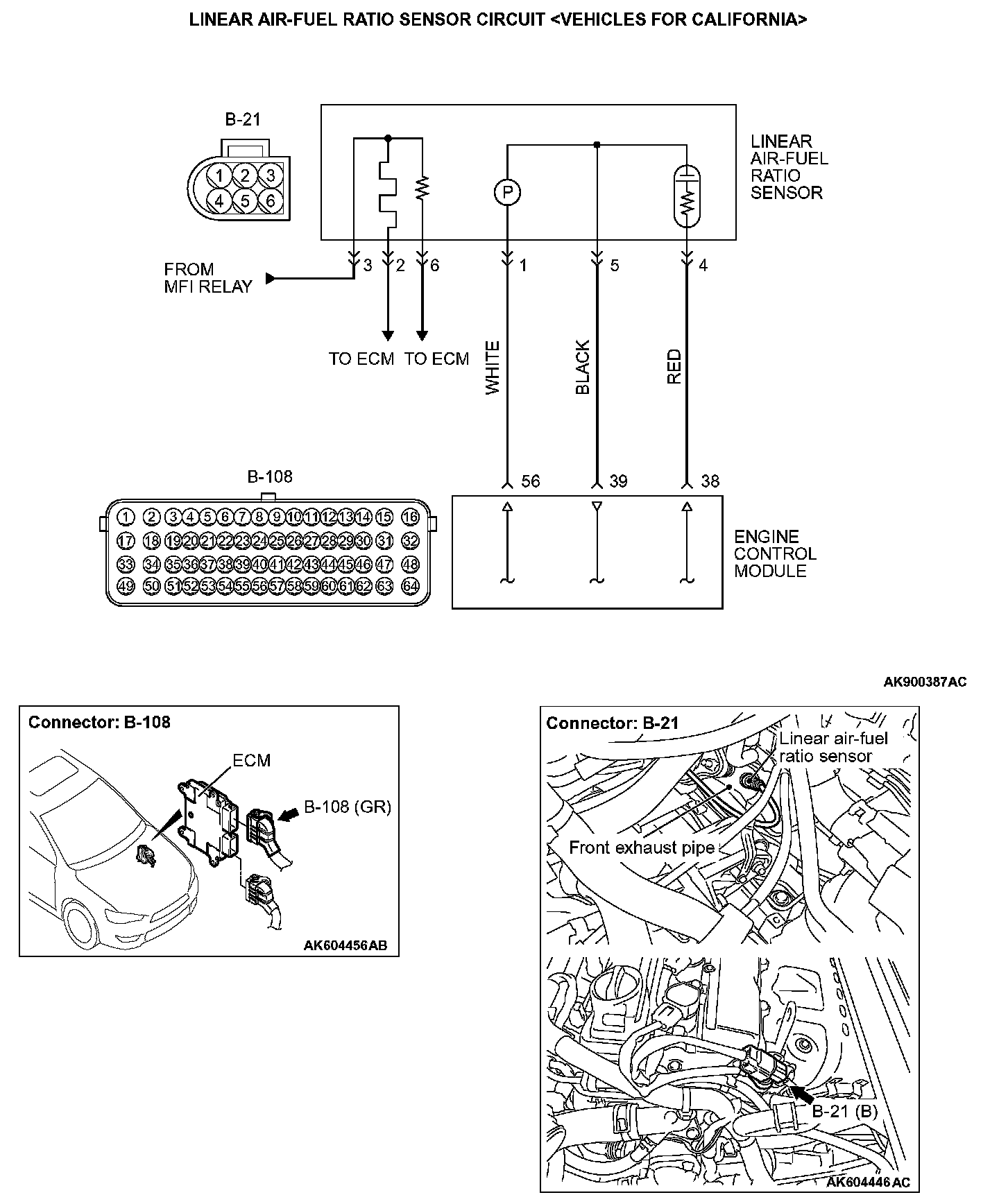 - The line between the linear air-fuel ratio sensor (terminal No. 1) and the ECM (terminal No. 56) detects the air-fuel ratio.