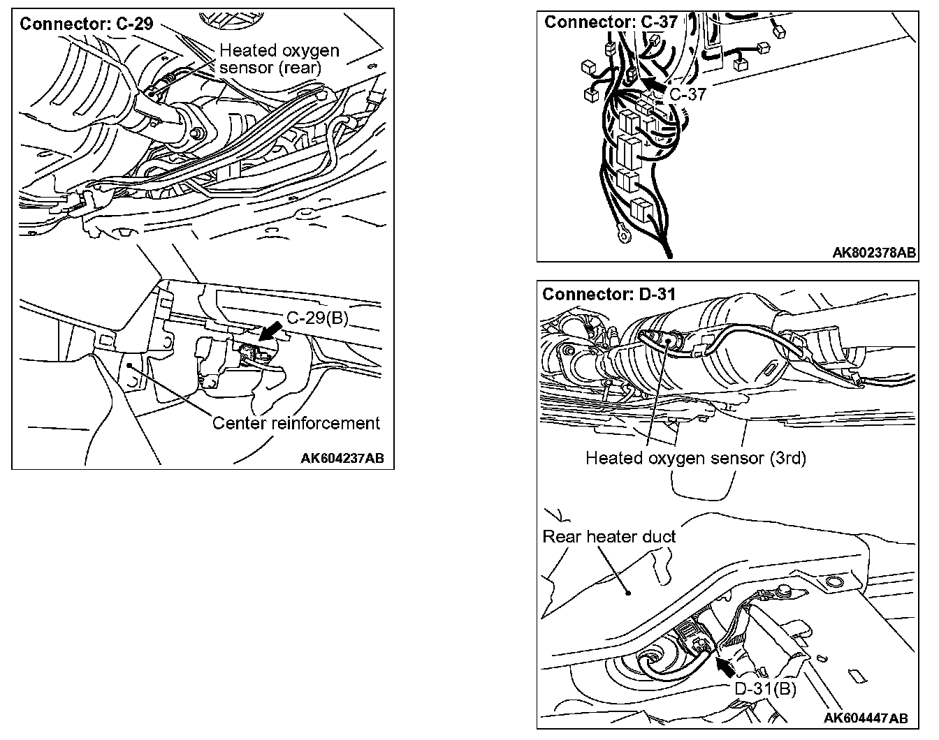 STEP 1. Check harness connector C-29 at heated oxygen sensor (rear) and D-31 at heated oxygen sensor (3rd) for damage.